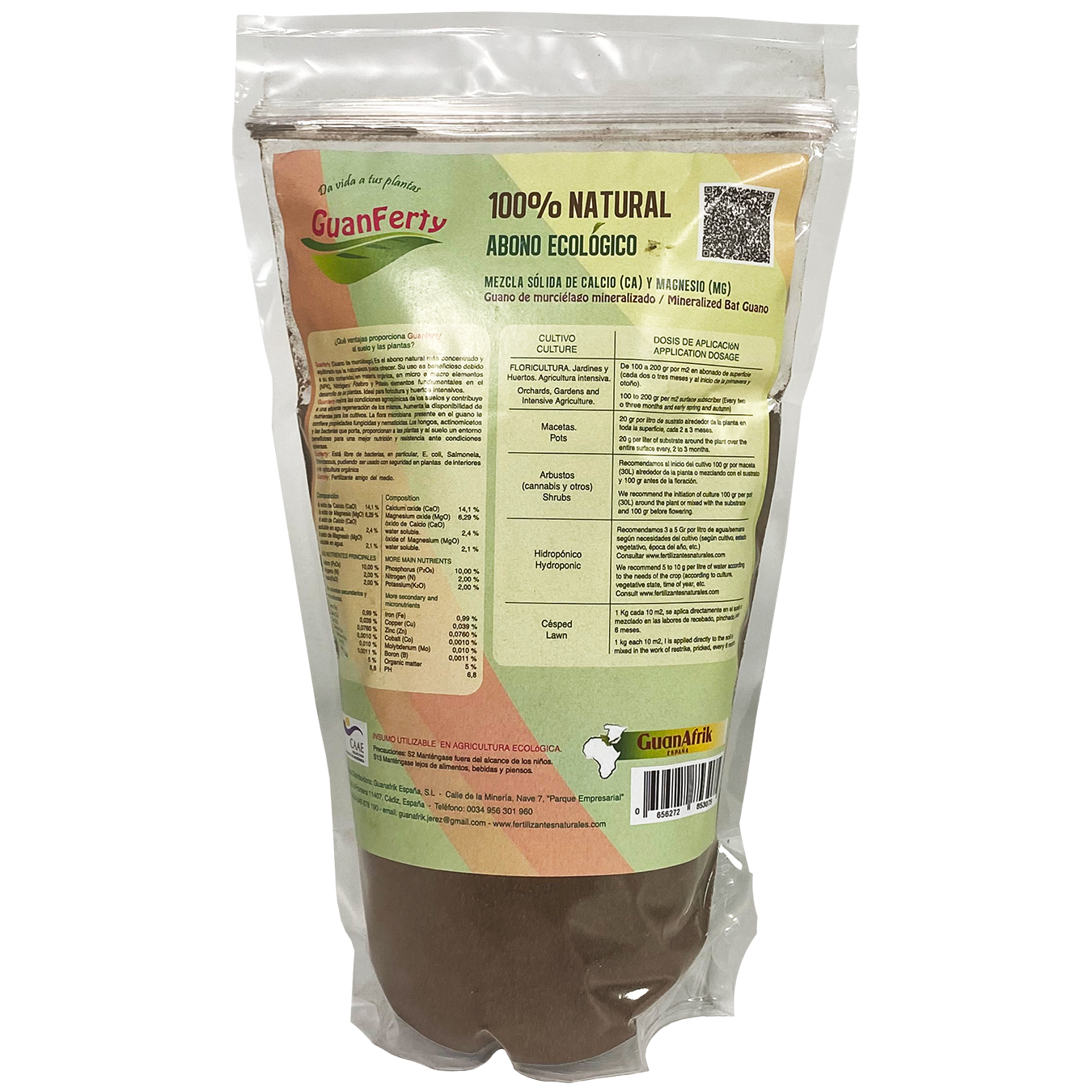 It is more than a Natural fertilizer, it contains primary elements Phosphorus, Nitrogen and Potassium (NPK), elements secondary Magnesium, Calcium, and micronutrients such as Iron, Copper, Zinc, Cobalt, Boron, and a high percentage of organic matter, but above all this, the great microbial flora that accompanies it makes it the best, with a very important aspect to take into account Odourless!